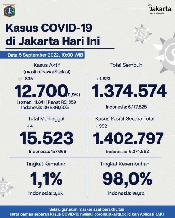 “Kami turut mengimbau agar masyarakat juga mewaspadai penularan virus Covid-19 karena pandemi belum usai. Upaya 3T terus digalakan dan vaksinasi Covid-19 yang juga masih berlangsung dengan cakupan yang lebih luas,” kata Kepala Bidang Pencegahan dan Pengendalian Penyakit, Dinas Kesehatan Provinsi DKI Jakarta, Dwi Oktavia, dikutip dari siaran pers PPID Pemprov DKI Jakarta, Senin (5/9/2022).