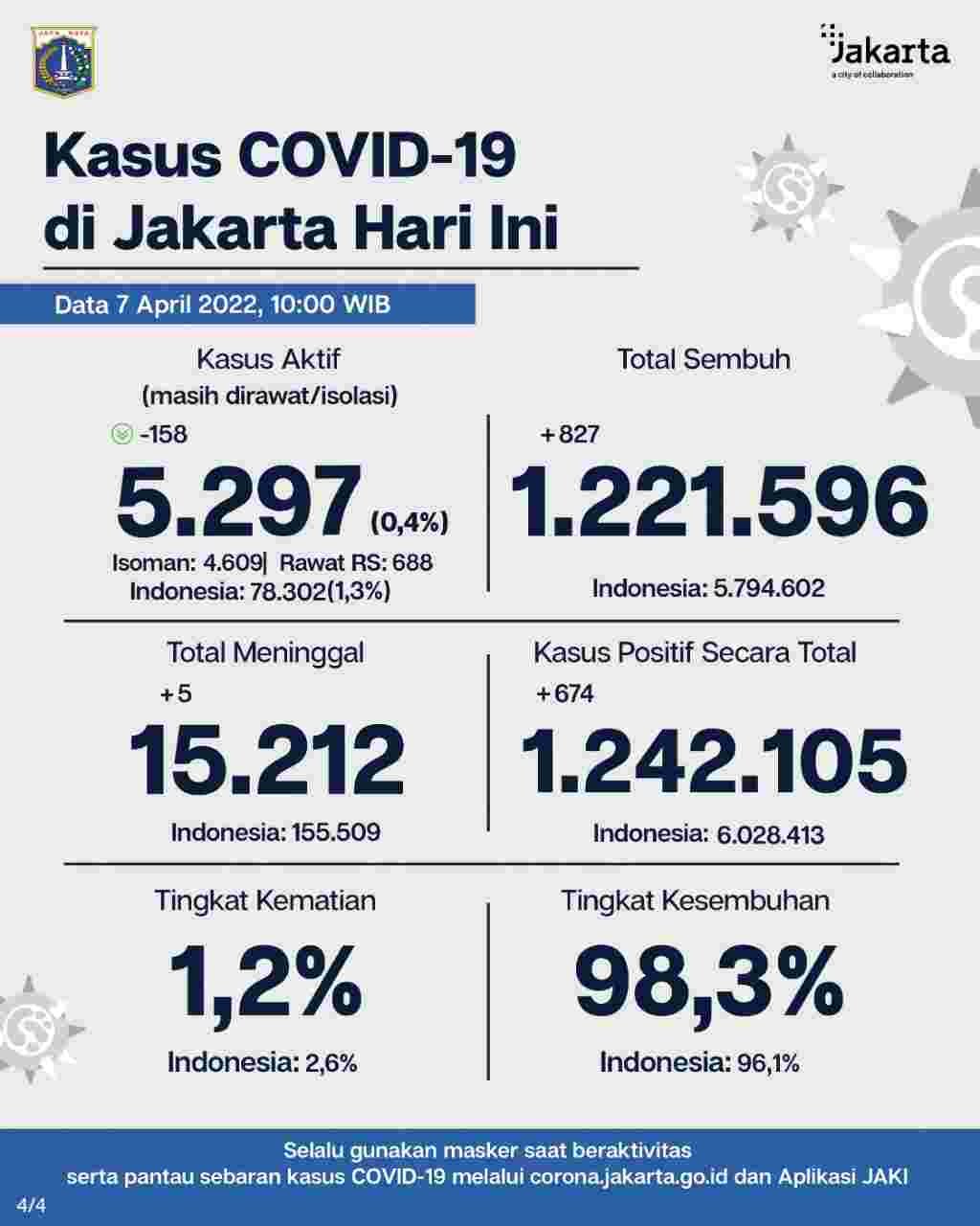 “Kami turut mengimbau agar masyarakat juga mewaspadai penularan Varian Omicron. Upaya 3T terus digalakan, selain vaksinasi Covid-19 yang juga masih berlangsung dengan cakupan yang lebih luas,” ungkapnya dikutip dari siaran pers PPID Pemprov DKI Jakarta, Kamis (7/4/2022).