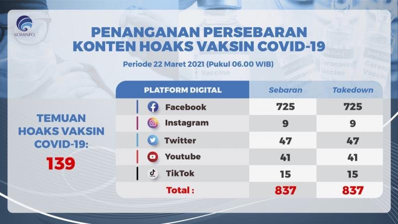 MATTANEWS.CO, JAKARTA– Kementerian Komunikasi dan Informatika (Kominfo) kembali merilis temuan Hoax Vaksin Covid-19. Per hari Senin (22/3/2021) ada 139 temuan isu hoax vaksin Covid-19 yang tersebar di lima platform media sosial.