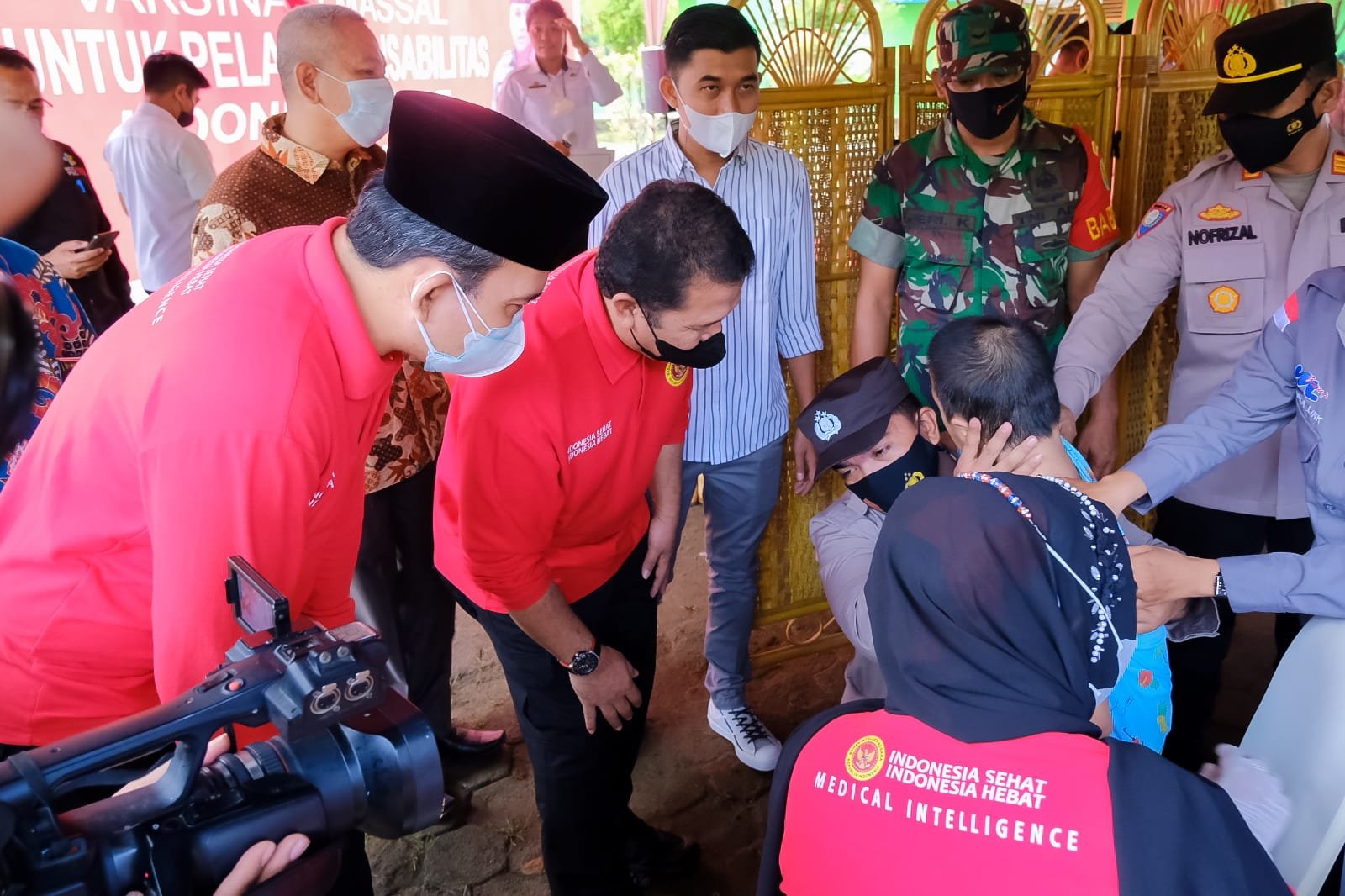 Para personil TNI, Polri turut andil bersama-sama menjemput langsung (door to door) para anak Berkebutuhan Khusus (Disabilitas) yang berusia di atas 12 tahun menuju lokasi pelaksanaan vaksinasi massal.