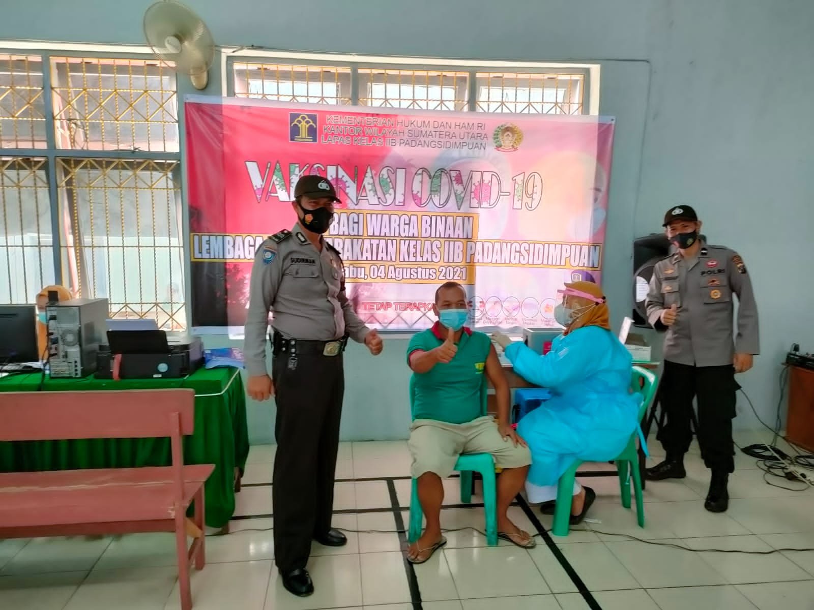 MATTANEWS.CO, PADANGSIDIMPUAN – Dalam rangka menyukseskan program vaksinasi Nasional, Lapas Klas IIB Kota Padangsidimpuan memberikan vaksin dosis pertama terhadap 100 warga binaan, Rabu (4/8/2021) pagi. Vaksinasi tersebut terwujud berkat sinergitas antara Lapas Klas IIB dengan Polres Padangsidimpuan. “Program vaksinasi ini merupakan wujud kepedulian pihaknya terhadap kesehatan para warga binaan,” ungkap Kepala Lapas (Kalapas) Klas IIB Kota Padangsidimpuan, Indra Kesuma, Amd IP, SH, MH, ke awak media.