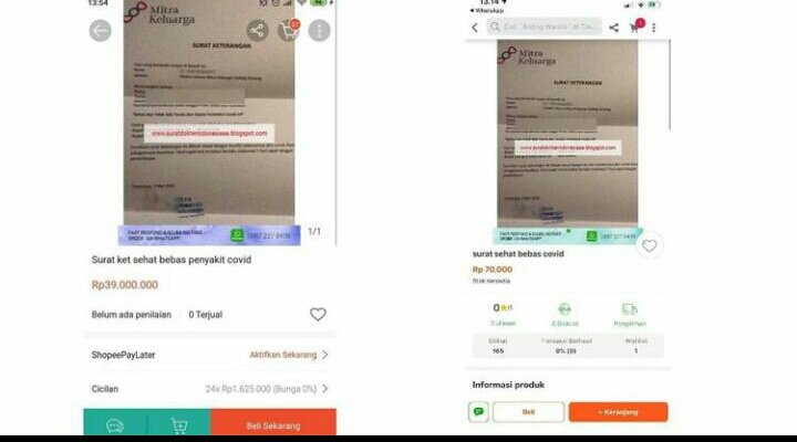 JAKARTA, Mattanews.co– Viral Beredar Tangkapan layar Surat Sehat Bebas Virus Corona (Covid-19) yang dijual di e-Commerce menjadi pembicaraan.
