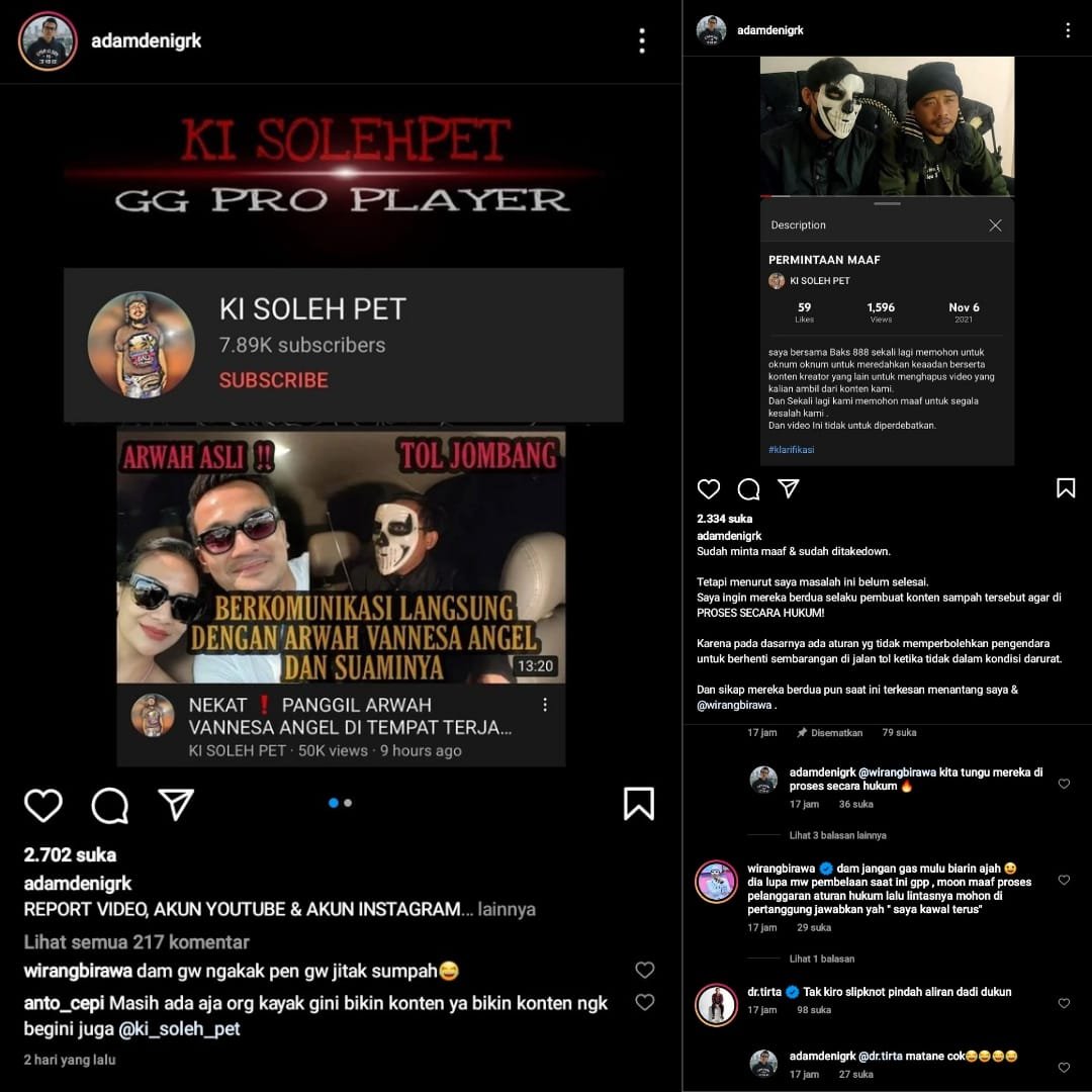 Beredarnya video tentang ‘Berkomunikasi Langsung bersama Arwah Vanessa Angel dan Suaminya’ membuat beberapa warga merasa resah. Salah satunya, Adam Deni. Ia menyebut akun Ki Soleh Pet dan Baks888 mencari panggung diatas kematian seseorang.