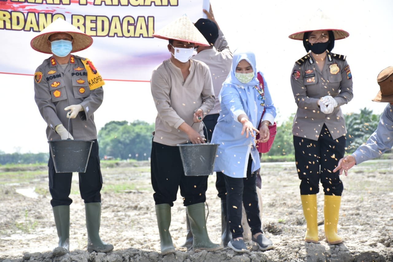 SERGAI, Mattanews.co – Wakil Bupati Sergai H.Darma Wijaya bersama Kapolres Sergai AKBP Robinson Simatupang, menggelar Tabur Benih Padi di lahan seluas 20 hektar sawah baru atau lahan baru, yang dicetak menjadi sawah di Dusun I Desa Paya Mabar Kecamatan Tebing Tinggi, kabupaten Serdang Bedagai, Sabtu (30/5/2020).