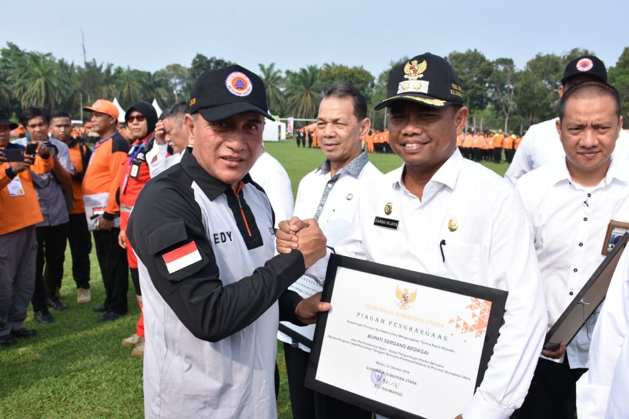 Dalam acara tersebut, Gubsu Edy Rahmayadi juga menyerahkan piagam penghargaan kepada Wabup Sergai H Darma Wijaya atas partisipasinya daldm rangka pengurangan resiko bencana.