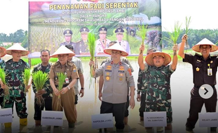 MATTANEWS.CO, JAMBI — Wakil Kepala Kepolisian Daerah (Wakapolda) Jambi, Brigjen Pol. M. Mustaqim, turut mendampingi Wakil Gubernur Jambi dalam kegiatan tanam padi serentak se-Provinsi Jambi yang digelar di Desa Tunas Mudo, Kecamatan Sekernan, Kabupaten Muaro Jambi, Selasa (22/4/2025).