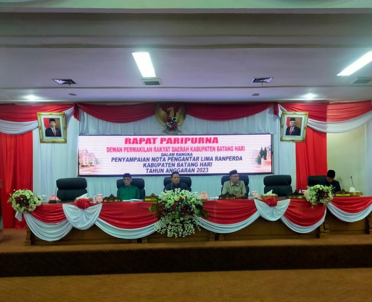 Paripurna berlangsung di Gedung Sekretariat DPRD, Jalan Jendral Sudirman, Selasa (15/8/2023) dihadiri oleh Wakil Bupati Batanghari Bakhtiar, unsur DPRD, Forkopimda, serta jajaran Pemkab Batanghari. Wakil Ketua DPRD M. Jaafar, membuka secara resmi jalannya sidang paripurna tentang pembahasan lima ranperda tersebut.