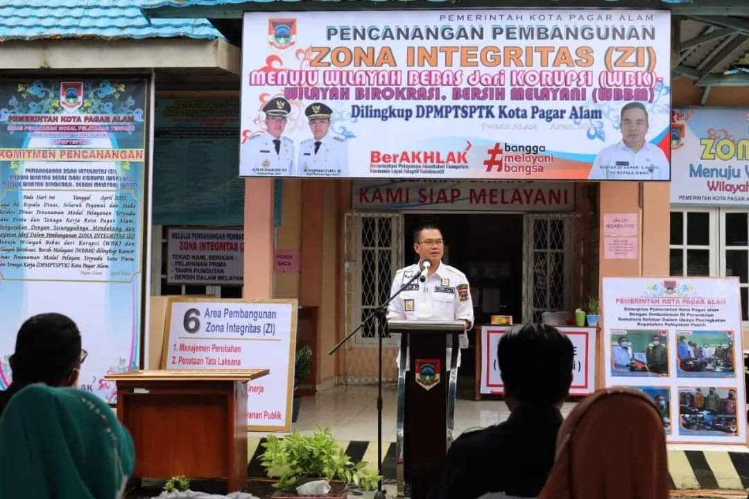 MATTANEWS.CO, PAGAR ALAM – Wali Kota (Wako) Pagar Alam Alpian Maskoni menghadiri pencanangan Zona Integritas (ZI) menuju Wilayah Bebas Korupsi (WBK) dan Wilayah Birokrasi Bersih dan Melayani (WBBM) di Dinas Penanaman Modal Pelayanan Terpadu Satu Pintu dan Tenaga Kerja (DPMPTSPTK) Kota Pagar Alam, Rabu (20/04/2022).