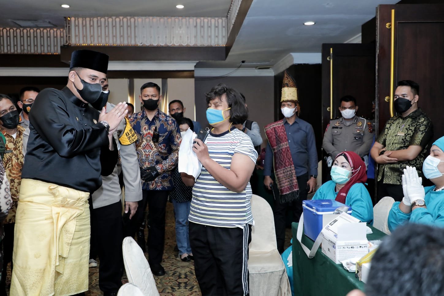 MATTANEWS.CO, MEDAN – Wali Kota Medan Bobby Nasution meninjau pelaksanaan Vaksinasi yang digelar Alumni Akpol angkatan tahun 1995 di Ballroom hotel Emerald Garden, Jumat (4/9). Diharapkan kegiatan vaksinasi ini dapat membantu Pemko Medan yang saat ini tengah mempercepat akselerasi vaksinasi di Kota Medan.
