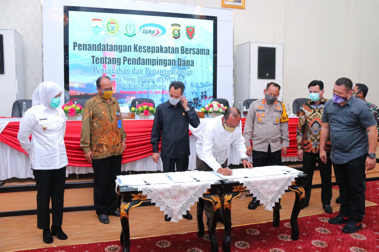 Agar pengalokasian dana penanggulangan pandemi covid-19 tepat peruntukan dan tepat sasaran serta transparan, Pemkot Palembang melakukan penandatangan kesepakatan bersama tentang pendampingan dana pencegahan dan penanggulangan corona virus disease (covid-19) yang ditandatangani walikota Palembang, perwakilan BPKP, Kejari, TNI dan Polri, Jum’at (17/04/2029).
