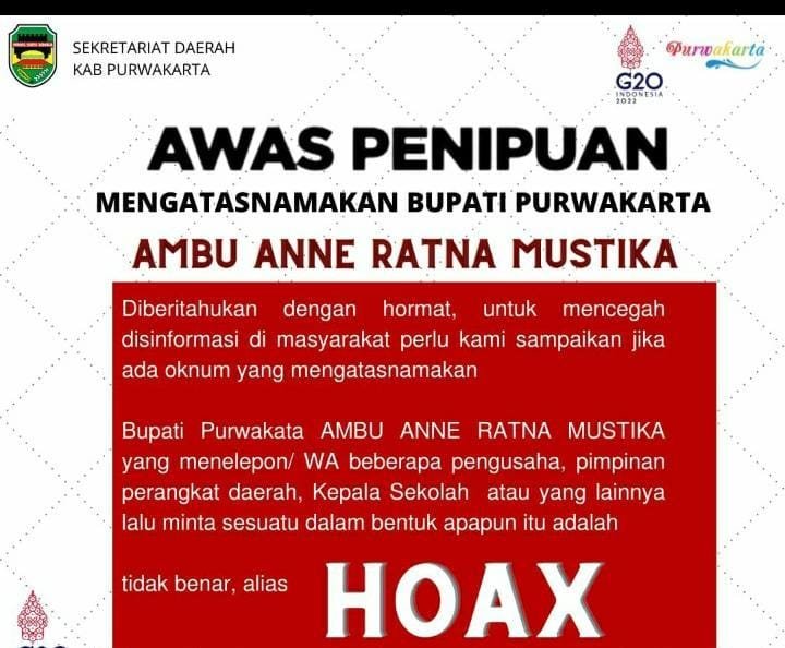 MATTANEWS.CO, PURWAKARTA – Dengan modus penggalangan donasi untuk yayasan, Ponpes, Rumah Tahfidz dan PAUD. Oknum ditenggarai melakukan upaya penipuan dengan mengatasnamakan orang nomor satu di Purwakarta melakukan aksinya melalui pesan elektronik jejaring WhatsAap.