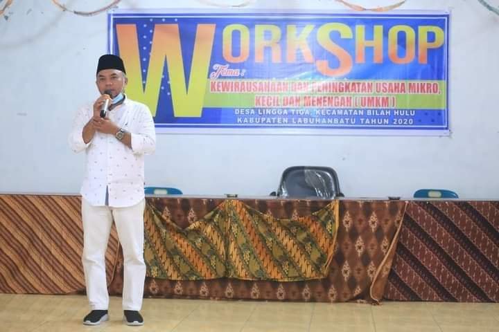 LABUHANBATU, Mattanews.co – Bupati Labuhanbatu H Andi Suhaimi Dalimunthe bersama rombongan beberapa pimpinan OPD hadiri Workshop Kewirausahaan dan Peningkatan Usaha Mikro, Kecil dan Menengah (UMKM) bersama mahasiswa Universitas Labuhanbatu (ULB) di Aula Kantor Desa Lingga Tiga Kecamatan Bilah Hulu Sabtu (19/9/2020).